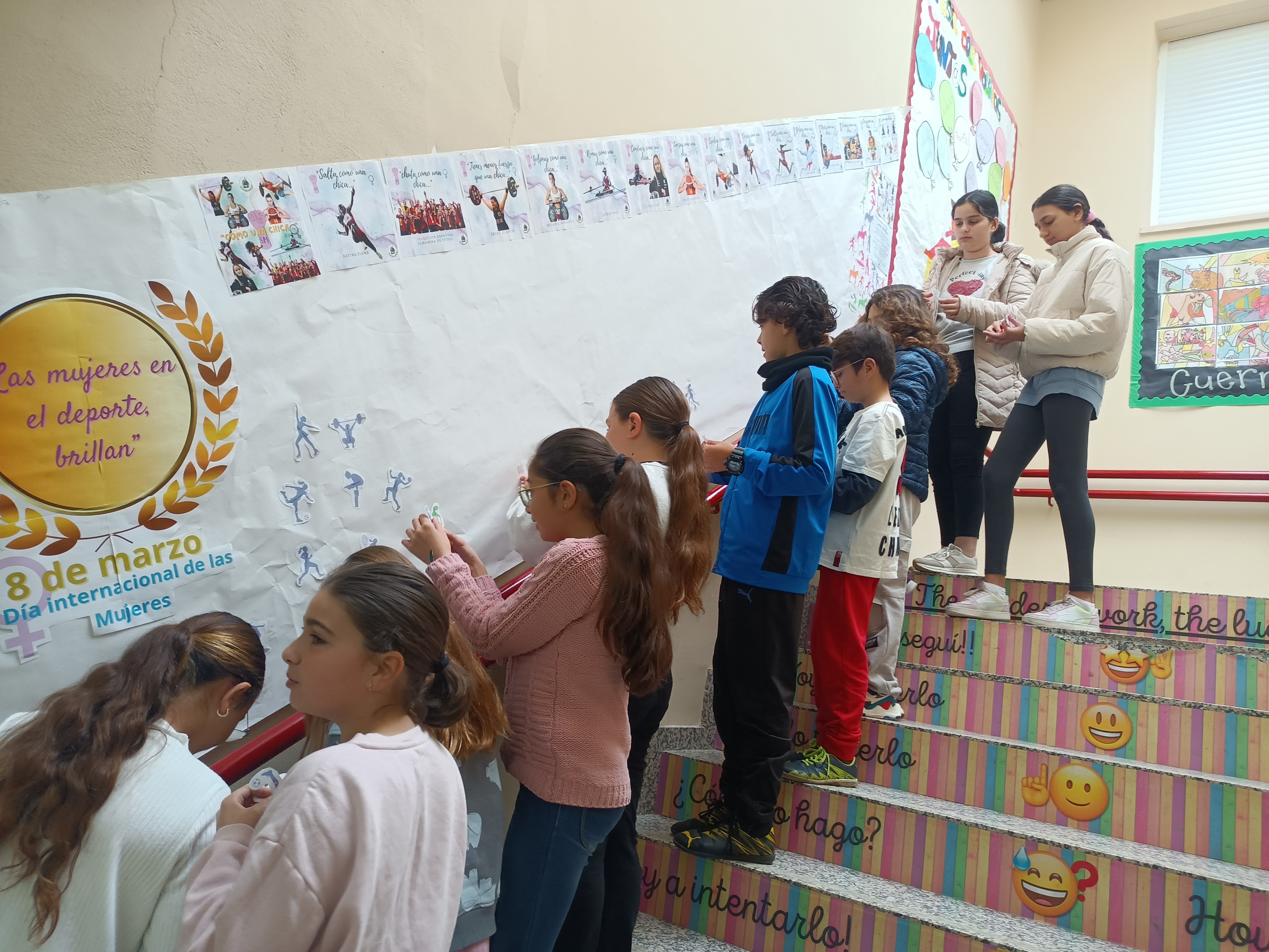 Este mural fue el resultado del trabajo conjunto de todo el alumnado. Sobre siluetas de mujeres practicando distintos deportes, cada niño y niña escribió frases inspiradoras que resaltaban valores como el esfuerzo, la perseverancia y la valentía de las mujeres en el ámbito deportivo. Además, incluimos imágenes de deportistas españolas que han marcado la historia bajo el lema “Como una chica”, una expresión que reivindicamos con orgullo para demostrar que el talento y la pasión no tienen género.